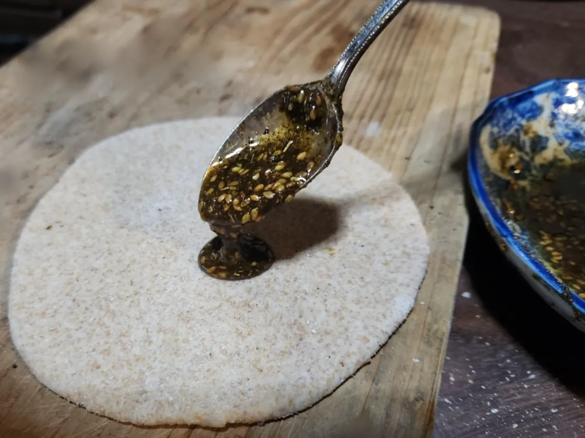 6.小麦粉を薄くふった台の上で麺棒を使って、丸めた生地を平たい円形に伸ばし、その上にザータルスパイスとオリーブオイルを混ぜたものを塗り広げます。