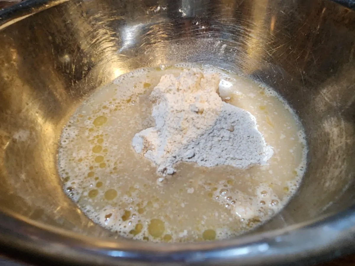 1.器にぬるま湯、砂糖、ドライイーストを入れて混ぜ合わせ、10分程度置いてイーストを活性化させます(冬は温かい場所に置いてください)。