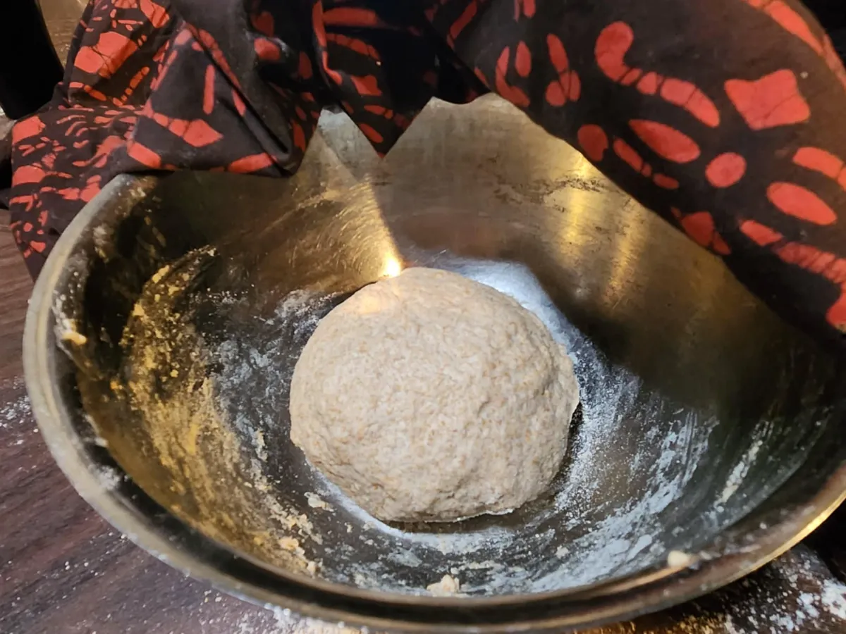 4.できあがった生地を丸めて布などでカバーし、20℃~25℃程度の暖かい場所で、生地が発酵して膨らむまで1時間程度静置します。