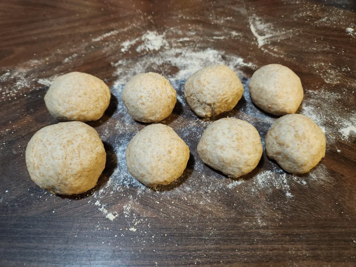 5.空気を抜くように生地を丸め直して、8等分します。再びカバーしてさらに30分間放置して膨らませます。
