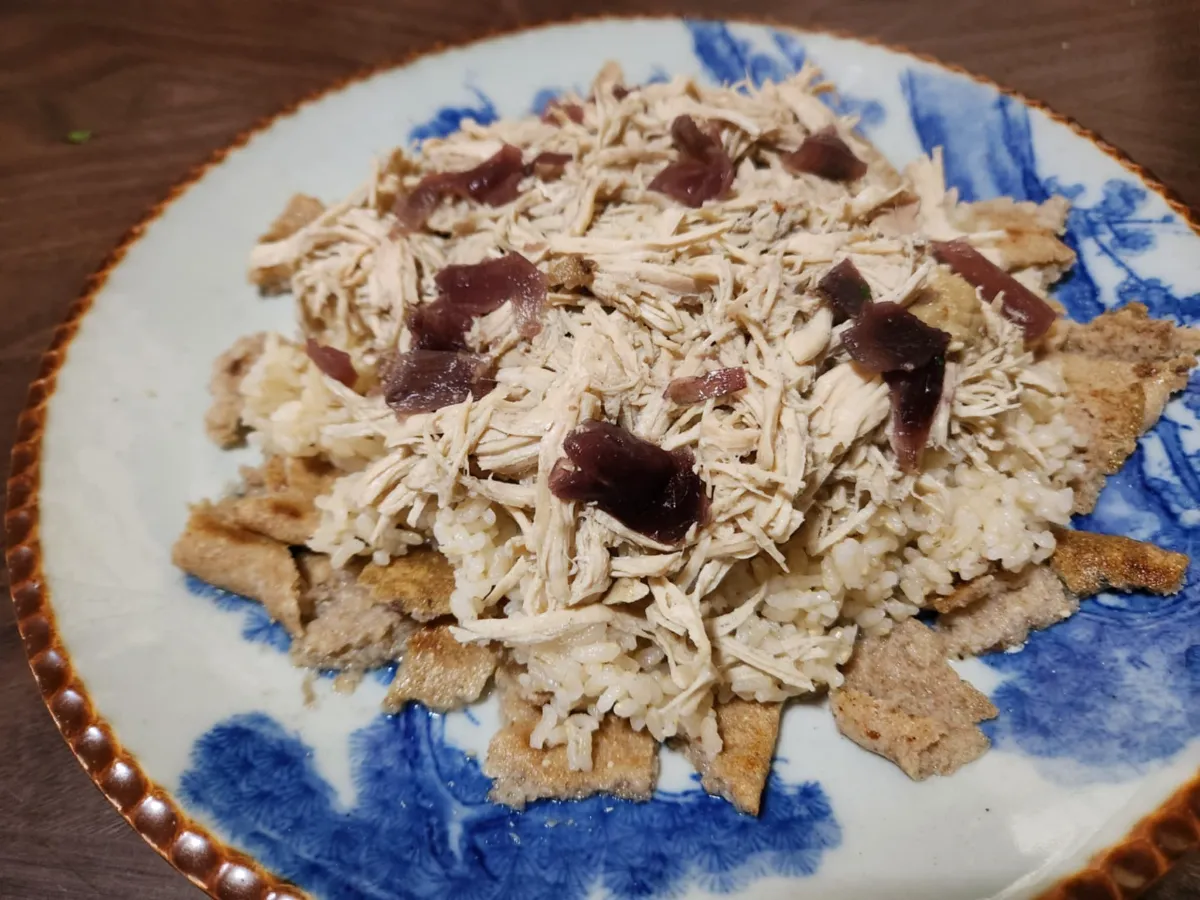6.2.で炊いたお米を乗せ、その上にほぐした鶏肉も乗せていきます。