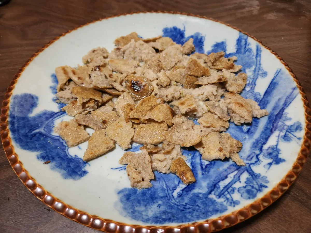 5.3.で炒めたパンをお皿に敷き詰めて、上から鶏肉を茹でた出汁をかけて染み込ませます。
