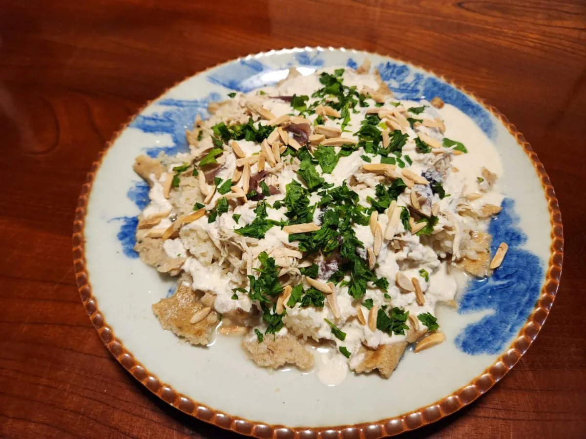 ファッテは、パレスチナをはじめとする中東地域でお祝いごとや週末の食事として広く愛される伝統料理で、料理名は「砕く」という意味のアラビア語 fatt (فتّ)に由来します。その名の通り、焼いたり揚げたりしたパンをちぎって使います。