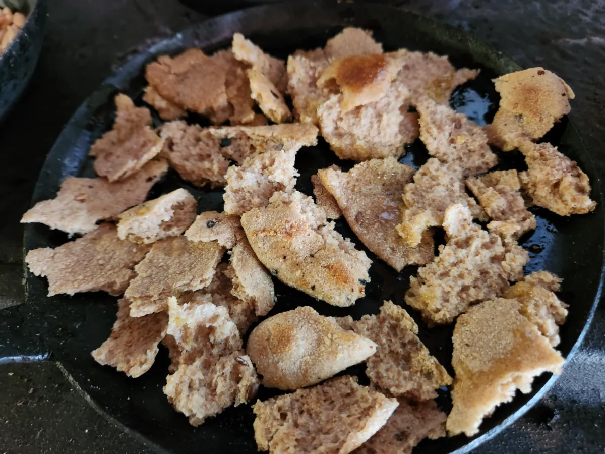 3.パンを一口サイズに細かくちぎり、カリッとするくらいまでオリーブオイルで炒めておきます。