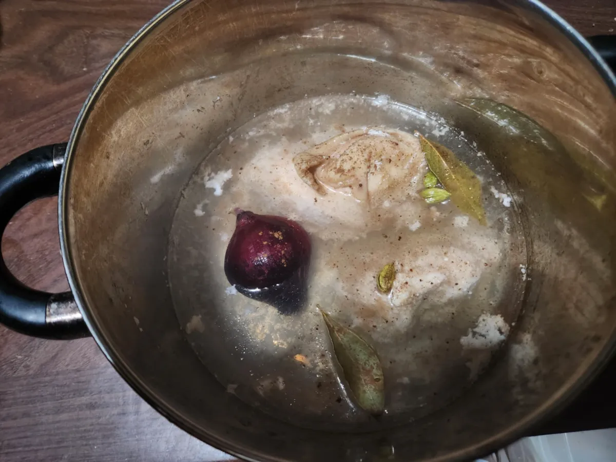 1.深さのある鍋に鶏肉と水、塩小さじ1程度を入れて火にかけ、沸騰したらアクを取り除きます。玉ねぎとローリエ2枚、カルダモン3粒、シナモン(この度はパウダーにしましたが、あればシナモンスティックがのぞましい)を追加して30分ほど弱火にかけておきます。