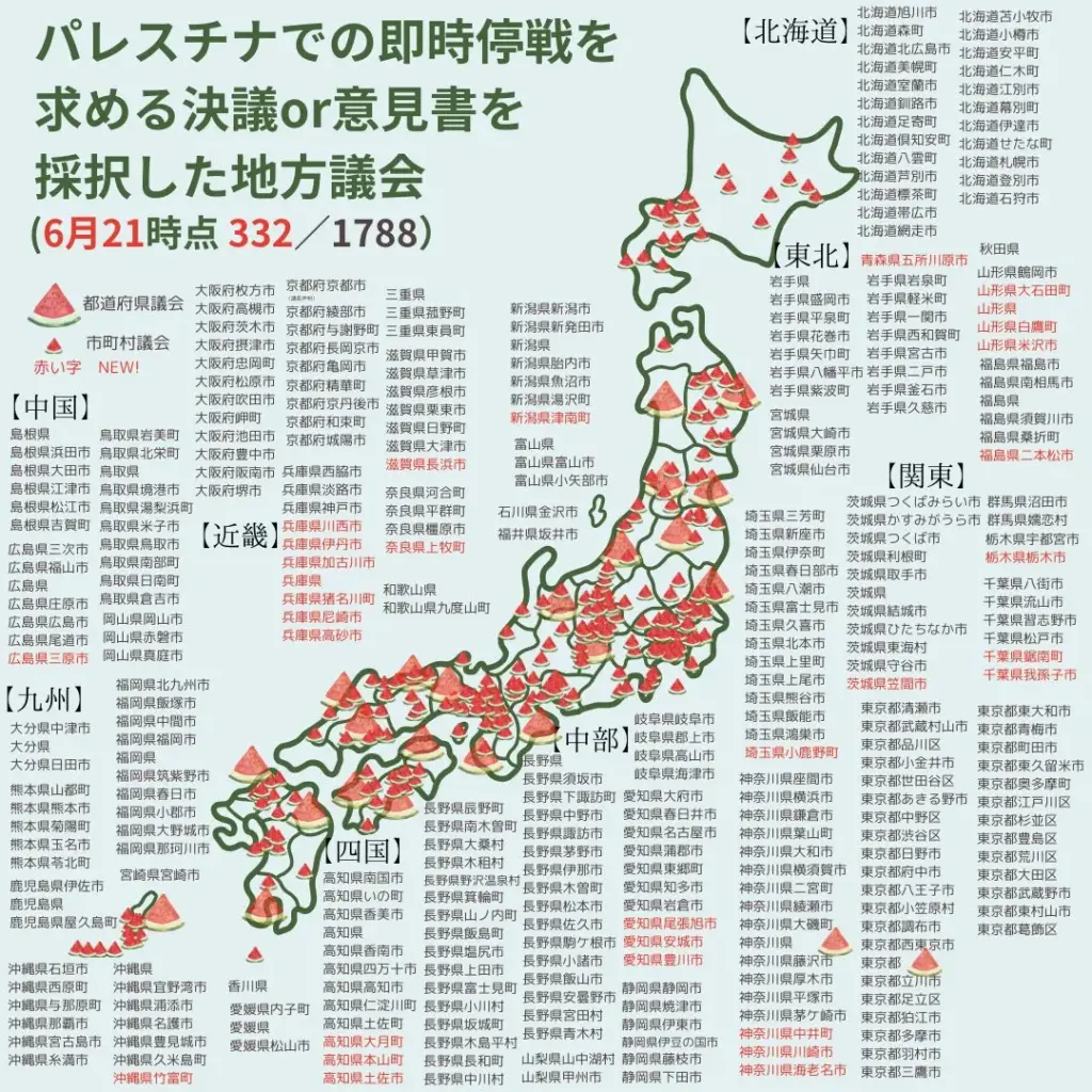 2024年6月21日時点で、即時停戦を求めて【332】の地方議会が決議/意見書を採択しています。